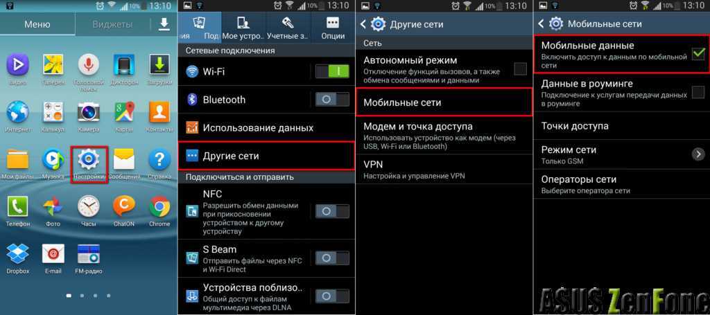 - Пятая – отключен мобильный интернет. Что делать? Откройте «Настройки» и выберите «Беспроводные сети», «Ещё», или «Дополнительно» (зависит от версии андроид). Затем «Мобильная сеть» или «Мобильные сети». В этом разделе поставьте птичку напротив «Передача данных включена».