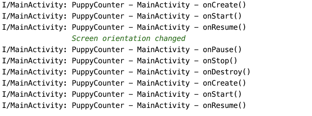 Вы можете видеть, что когда поменялась ориентация экрана, приложение уничтожило активити в портретной ориентации, а затем создало и возобновило новую активити в горизонтальной ориентации. Поскольку в MainActivity.kt у вас нет никакой логики для сохранения и восстановления состояния счетчика, действие было потеряно во время этого процесса.