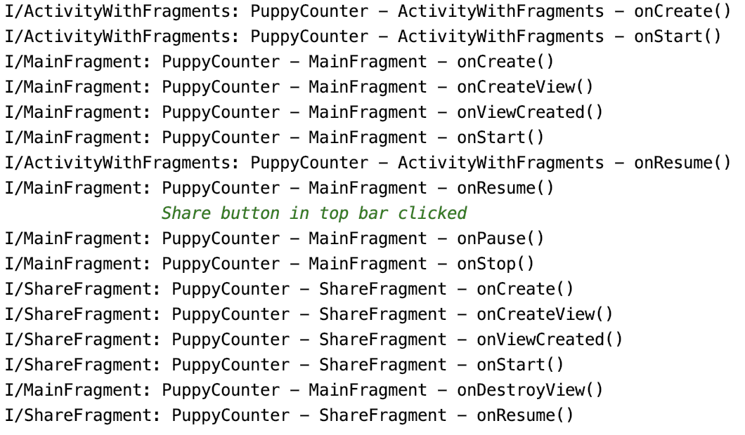 Теперь, когда вы лучше понимаете, что скрывается под капотом, переходите между основным экраном и экраном Share, чтобы увидеть танец жизненного цикла фрагмента. ![]()