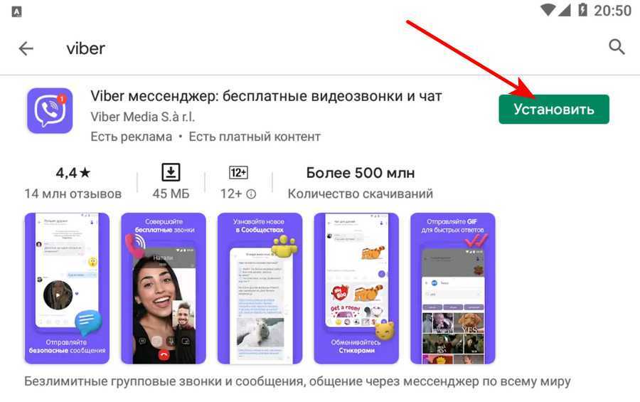 Откройте Google Play и введите в поисковой строке название приложения. Кликните по иконке Вайбера, а на странице программы нажмите кнопку «Установить».