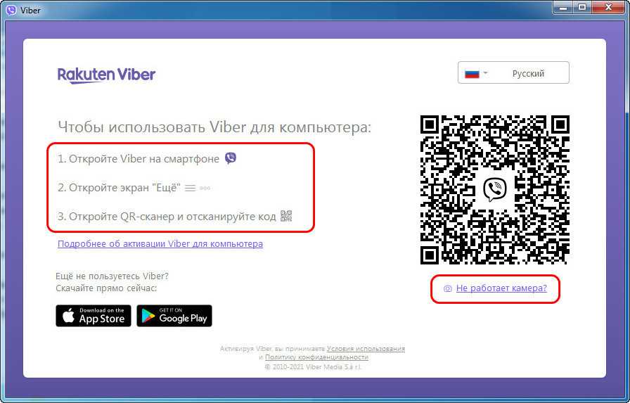 Если используем чужое iOS/Android-устройство с камерой, можем синхронизировать компьютерную программу Viber с использованием QR-кода, как описано в инструкции программы. Если чужое устройство, например, с повреждённой камерой, либо мы выбрали вариант с Android-эмулятором, жмём «Не работает камера?».