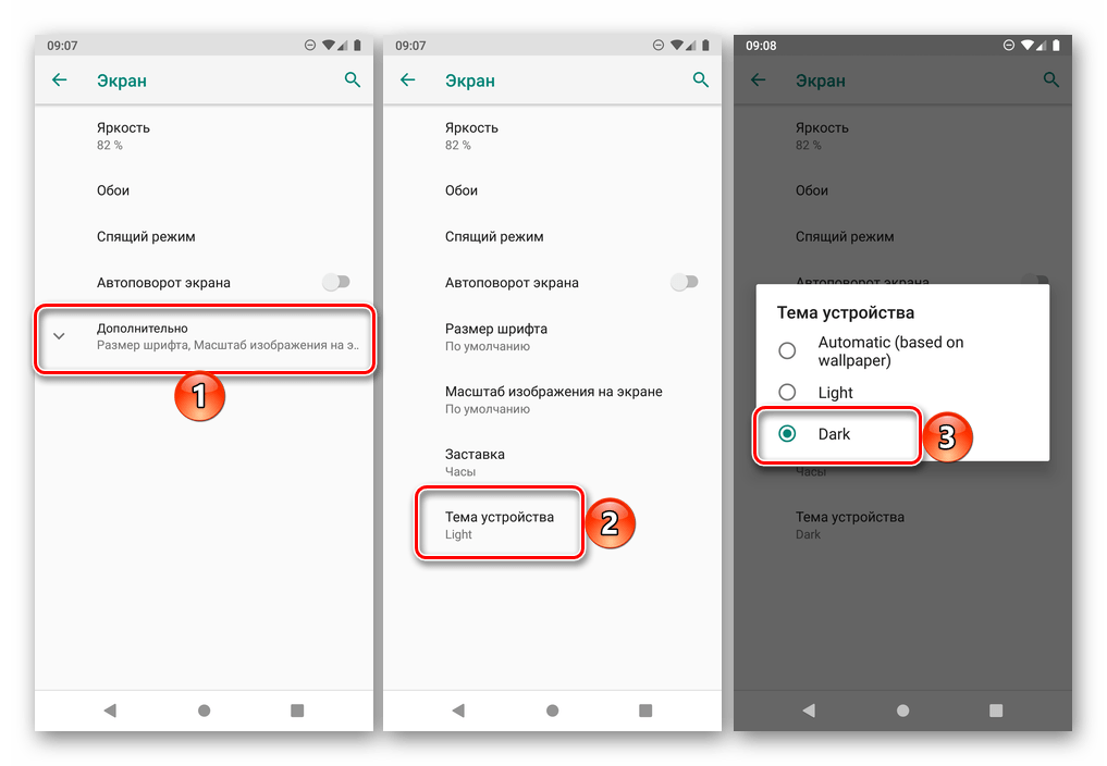 На Андроиде включить режим Dark в настройках нельзя. Потребуется дополнительный интерфейс: