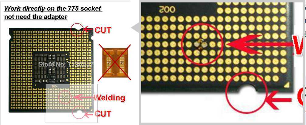 А ещё сделаны в нужых местах пропилы и процессор становится в слот, как родной (а он рассчитан на 771 сокет). То есть, не потребуется ничего вырезать в материнке – это большой плюс!