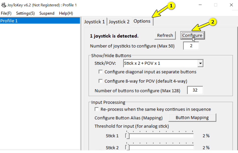 Итак, после загрузки архива с приложением просто извлеките все файлы в отдельную папку и запустите исполняемый файл JoyToKey.exe (от имени администратора). Далее перейдите в раздел «Options» и нажмите «Configure».