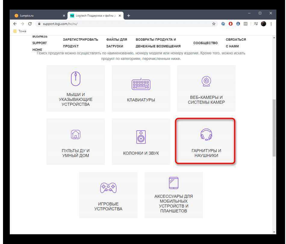 При появлении списка продукции щелкните по плитке «Гарнитуры и наушники».