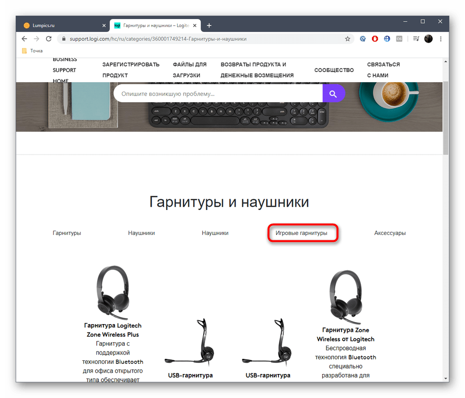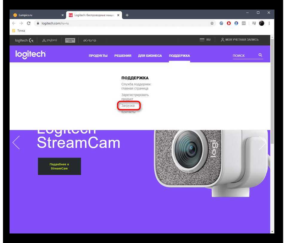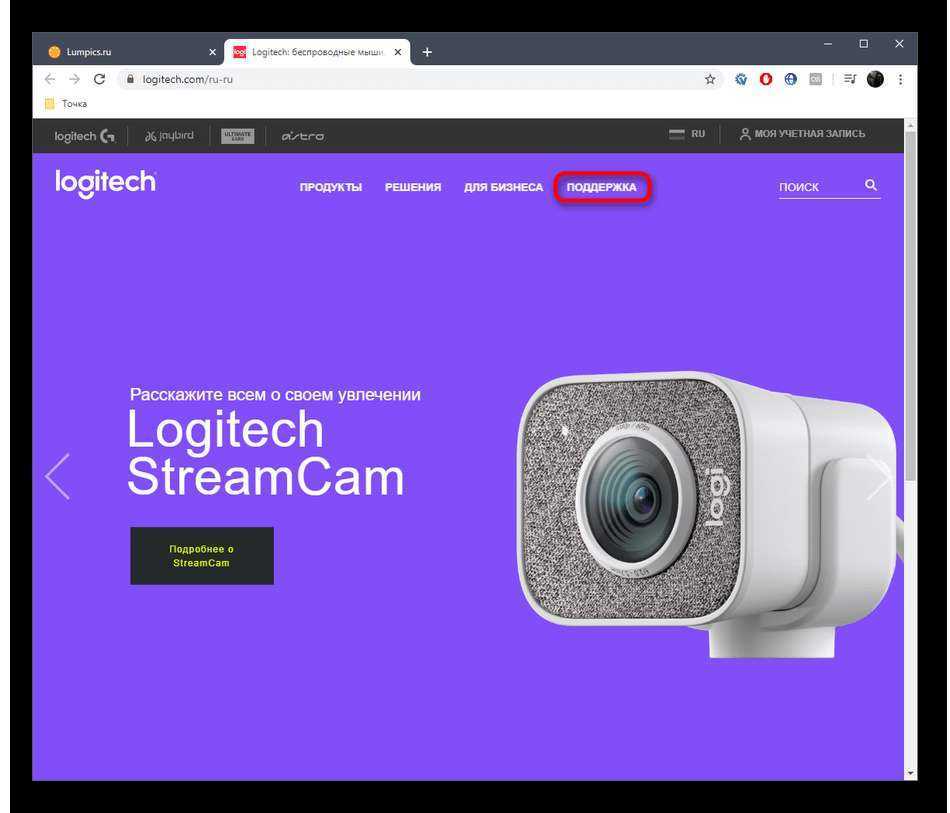 - Воспользуйтесь ссылкой выше, чтоб перейти на главную страничку Logitech, где наведите курсор мыши на раздел «Поддержка».