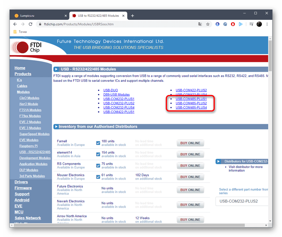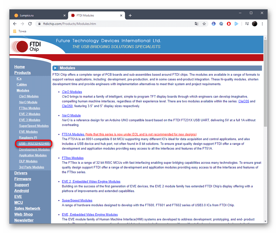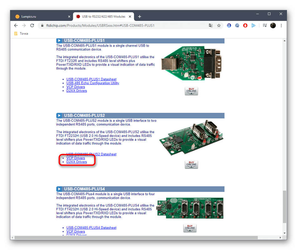 Сам конвертер RS485 собирают различные китайские компании, модернизируя корпус и отдельные детали, но плата чаще всего является фирменной разработкой компании FTDI, которая занимается созданием различных чипов, плат и переходников. Поэтому мы советуем поискать подходящий драйвер для этой платы на официальном сайте, ведь там все файлы проверены на работоспособность и точно будут совместимыми с операционной системой.
