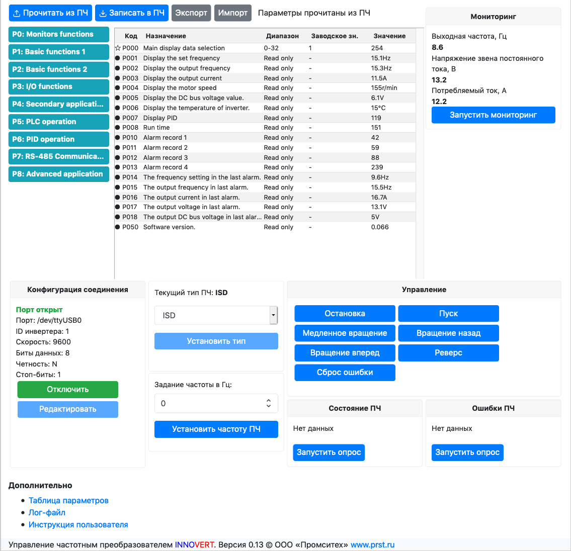 Через интерфейс можно производить все операции с ПЧ, доступные по протоколу Modbus: задание конфигурации соединения, установку типа ПЧ, чтение и запись параметров, экспорт и импорт параметров, опрос регистров статуса и ошибки, задание частоты вращения, управление ПЧ.