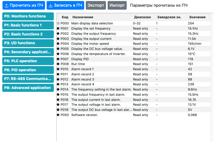 В этом разделе можно посмотреть текущую таблицу параметров ПЧ.