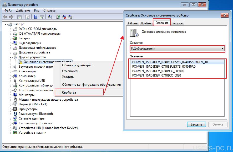 Откроется новое окно где нужно перейти на вкладку сведения, ниже из списка выбрать из выпадающего списка ИД оборудования. Ниже в окне будет информация об устройстве которое поможет нам найти нужный драйвер.