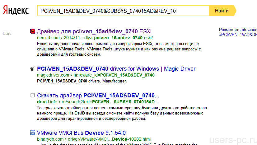 Пример показан на отсутствующем драйвере устройства в виртуальной машине VMware, и как видно из поиска по интернету в первой и четвертой строке поиска яндекса говорится именно о драйвере VMware.