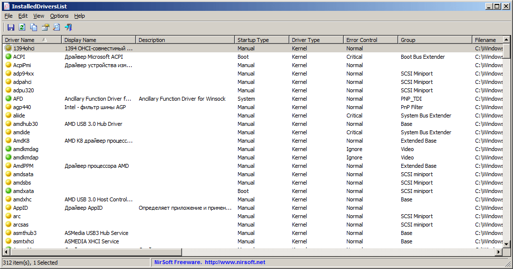 После того как скачали архив с программой, разорхивируйте его и запустите утилиту от имени администратора. Перед вам появится список всех установленных драйверов Windows со всеми деталями. С помощью двойного нажатия по интересуещему вас драйверу вы можете получить больше информации, такой как дата, версия и местоположение драйвера. Зеленая иконка обозначает что драйвер сейчас используется, если иконка желтая — драйвер установлен, но не активен. Если вы видите красную иконку, значит что с драйвером какие-то проблемы, и вы можете устранить их отключением или удалением данного драйвера.