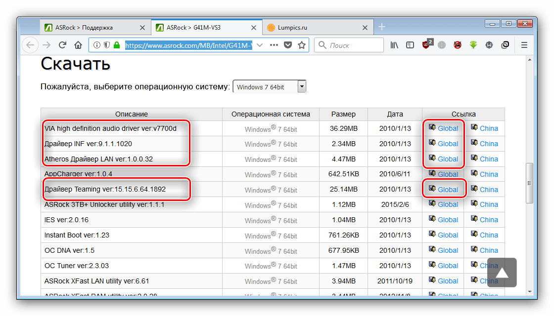 Найдите строки с нужными драйверами. Убедитесь, что представлены новейшие версии, после чего воспользуйтесь кнопками «Global» для загрузки каждого элемента.