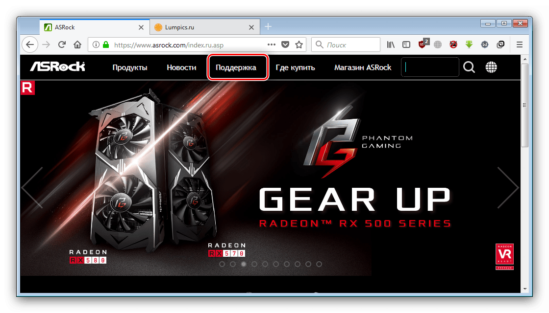 - Откройте ссылку выше. После загрузки страницы найдите в шапке пункт «Поддержка» и кликните по нему.
