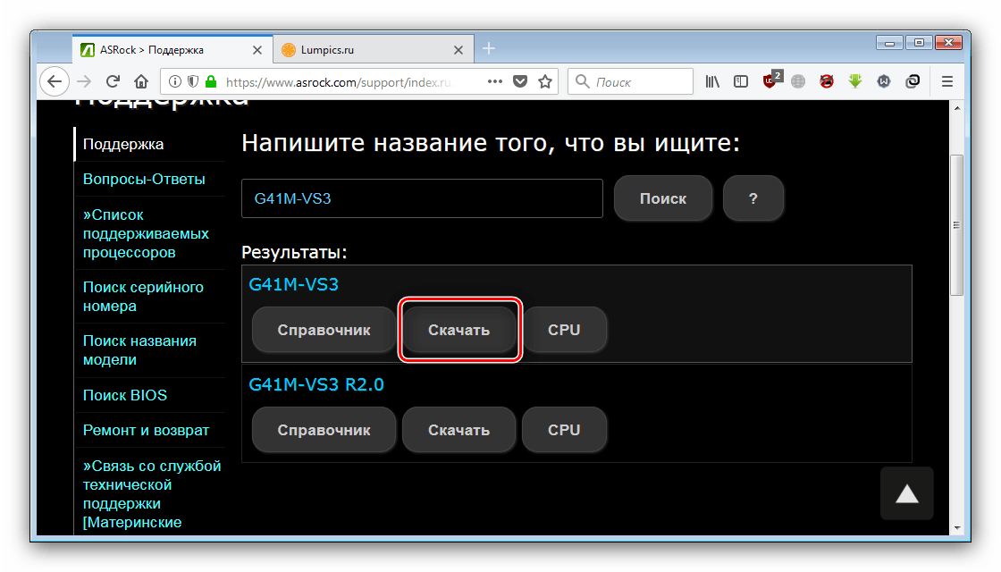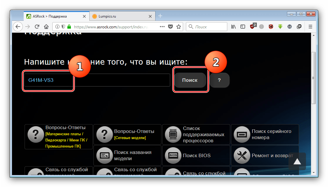 Затем следует воспользоваться поиском: впишите в текстовую строку наименование искомой модели — G41M-VS3 — и нажимайте «Поиск».