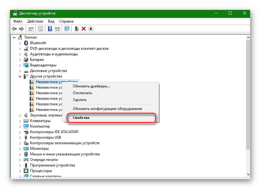 Особое внимание обратим на пункты «Неизвестное устройство» в «Диспетчере устройств». Обычно Виндовс, особенно новейших версий, способна самостоятельно определить распространённое оборудование и загрузить драйвера для него