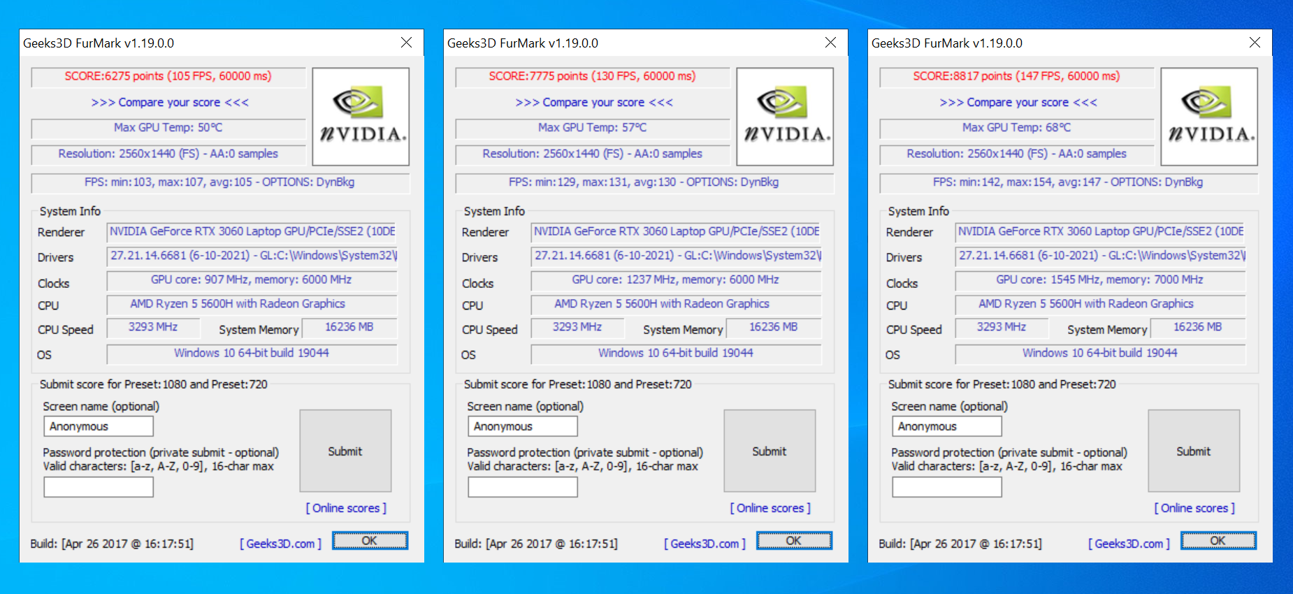 Задачей было протестировать какая температура и уровень шума будут в разных режимах производительности. Быстрый экспресс-тест (в течение минуты) проводился в FurMark на максимально возможной нагрузке.