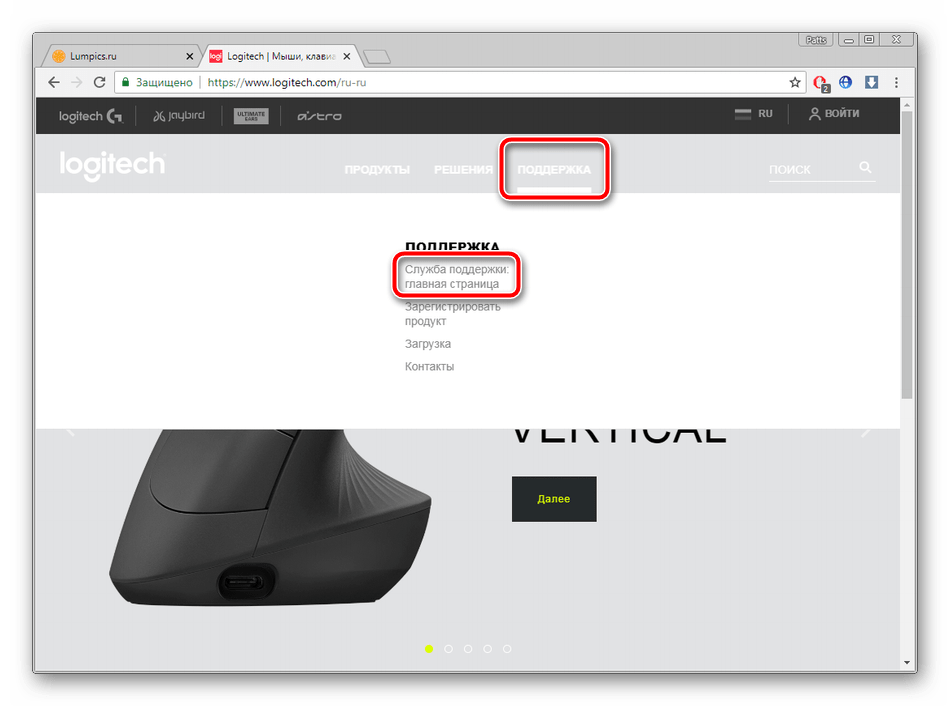 - На главной странице сайта Лоджитэк кликните на категорию «Поддержка», чтобы отобразилось всплывающее меню. В нем следует перейти к «Служба поддержки: главная страница».