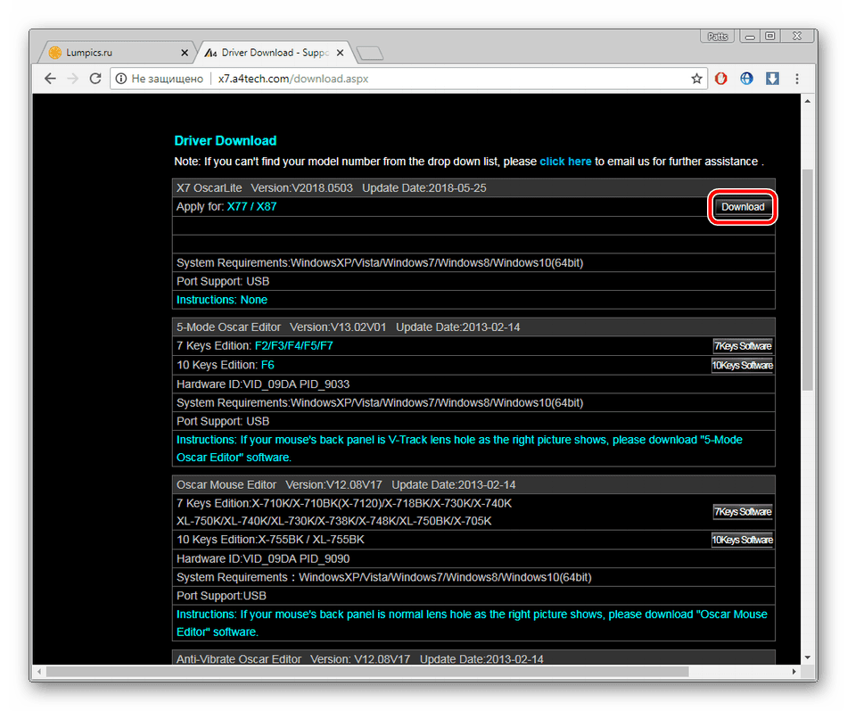 Откроется страница непосредственной загрузки Oscar. Здесь несколько кнопок для загрузки драйвера, поэтому ищем ту, рядом с которой есть название вашей мышки: