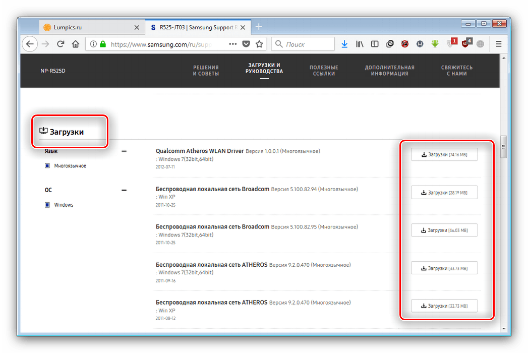 Теперь надо добраться к разделу «Загрузки» — для этого прокрутите страницу до нужной позиции. В указанном разделе размещены драйвера для всех компонентов устройства. Увы, но возможности скачать всё за раз нет, потому понадобится загружать отдельно каждый элемент нажатием на соответствующую кнопку. Лайфхак — лучше всего создать новый каталог на «Рабочем столе» или любом другом легкодоступном месте, куда и нужно скачать инсталляторы драйверов.