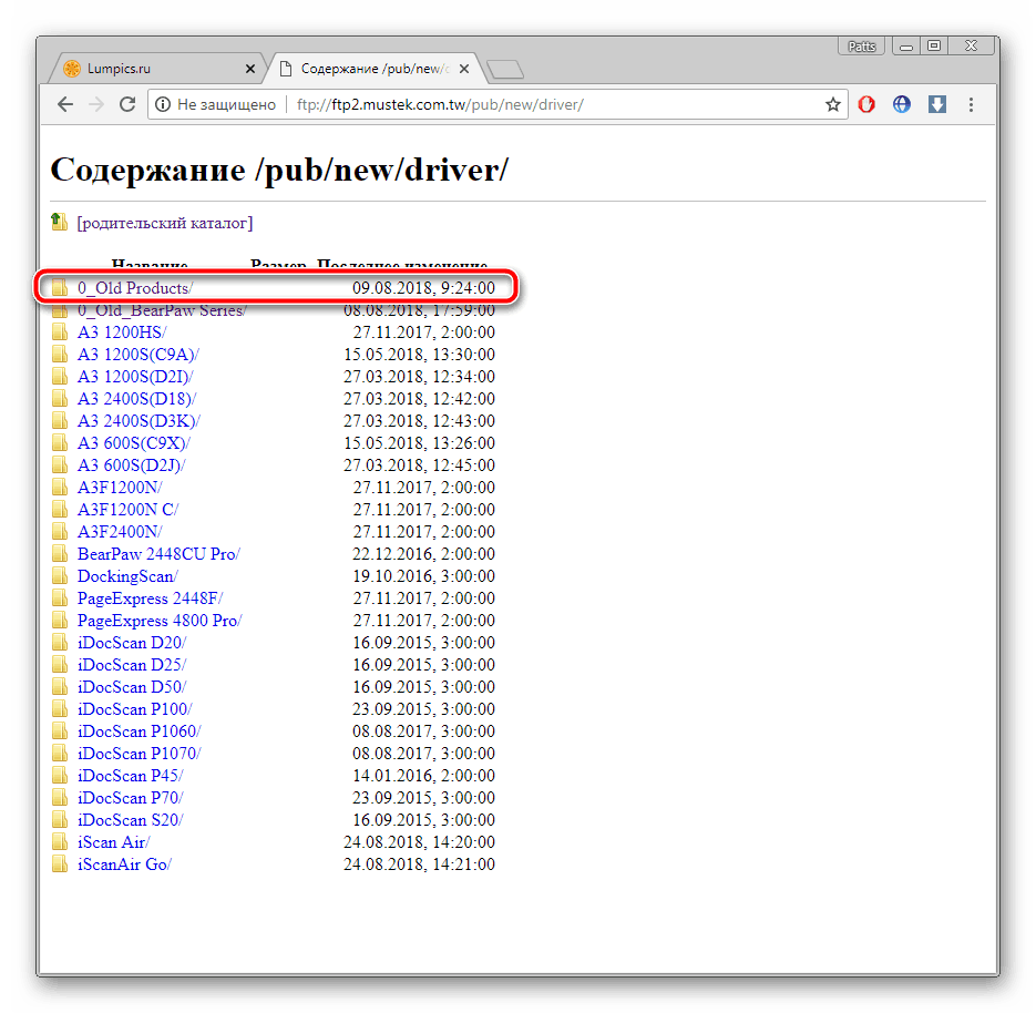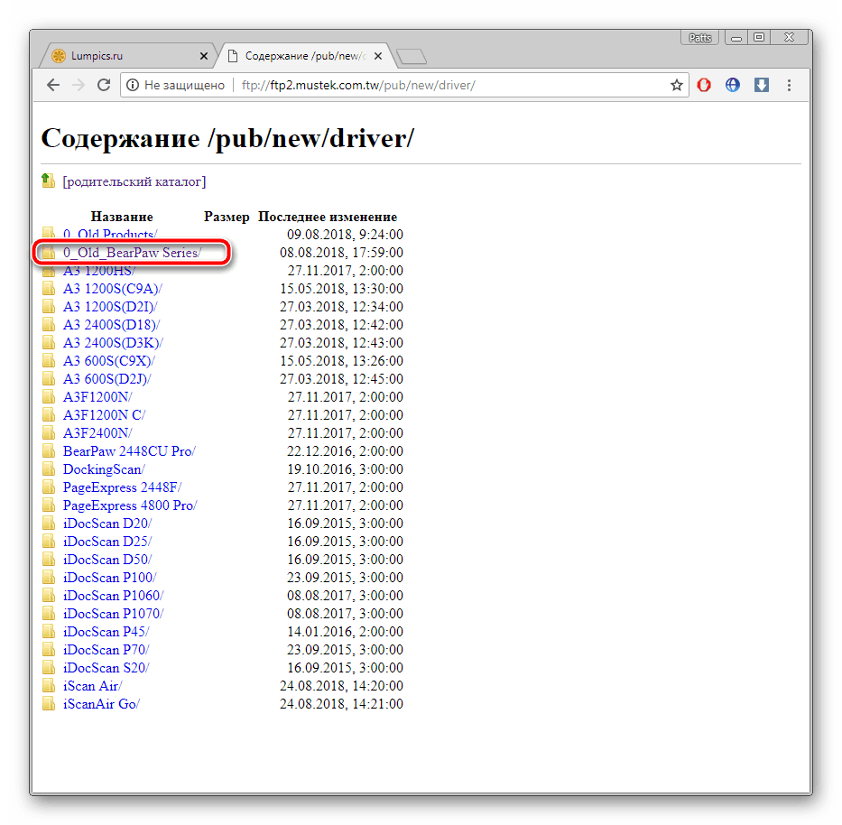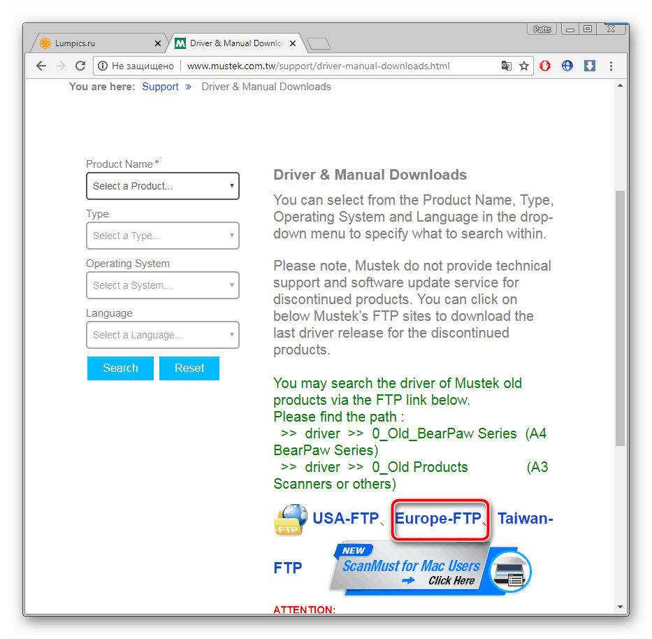 Вы увидите перед собой страницу, где производится поиск драйверов, однако BearPaw 1200CU Plus — старый сканер, поэтому его файлы были перенесены в FTP (протокол передачи данных по сети). Поэтому вам понадобится выбрать один из доступных протоколов. Рекомендуем перейти к европейскому, этот вариант наиболее подходящий.