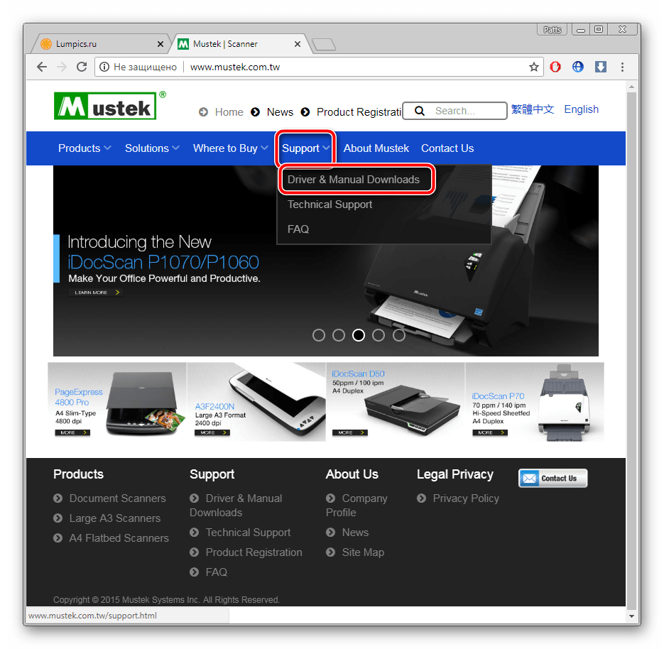 У упомянутого выше производителя имеется официальный веб-ресурс, где любой обладатель устройств может найти для себя всю необходимую информацию о продукции. Здесь присутствуют и директории с драйверами ко всем моделям сканеров. Их поиск и загрузка осуществляется следующим образом: