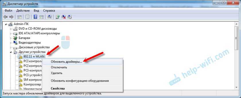 Снова заходим в диспетчер устройств. Нажимаем правой кнопкой мыши на «802.11n WLAN» и выбираем «Обновить драйверы».