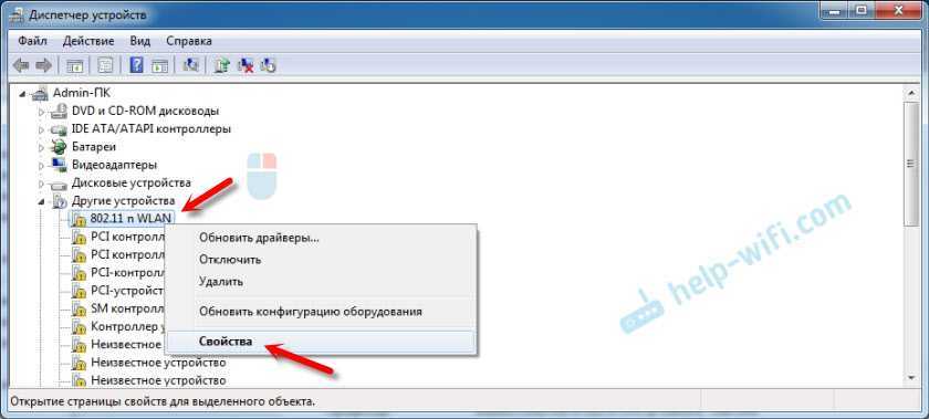 Там в разделе «Другие устройства» должно быть неизвестное устройство «802.11 n WLAN» с желтым восклицательным знаком. Это наш адаптер. Нужно узнать «ИД оборудования». Для этого откройте его «Свойства».