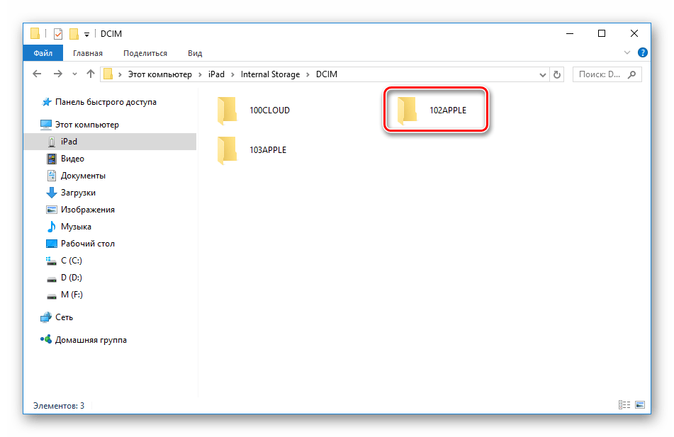 В следующем окне пользователь может увидеть несколько папок. Их количество всегда разное и зависит от того, сколько файлов сейчас хранится на устройстве, а также их месторасположения. Папка «100CLOUD» содержит в себе файлы, синхронизированные с iCloud. Нас же интересуют фотографии из внутренней памяти, поэтому выбираем «102APPLE» или «103APPLE».