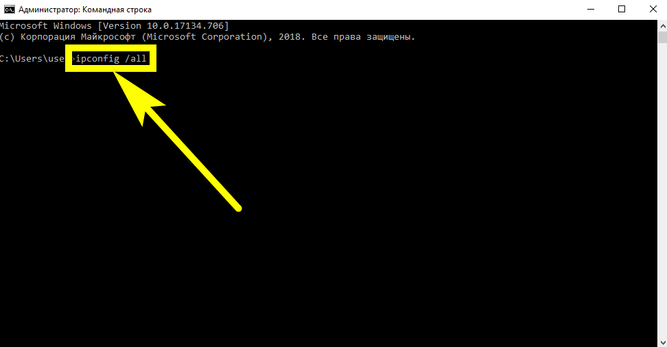 Ввести в открывшемся окошке команду ipconfig /all без лишних пробелов и кавычек и нажать на клавишу Enter.