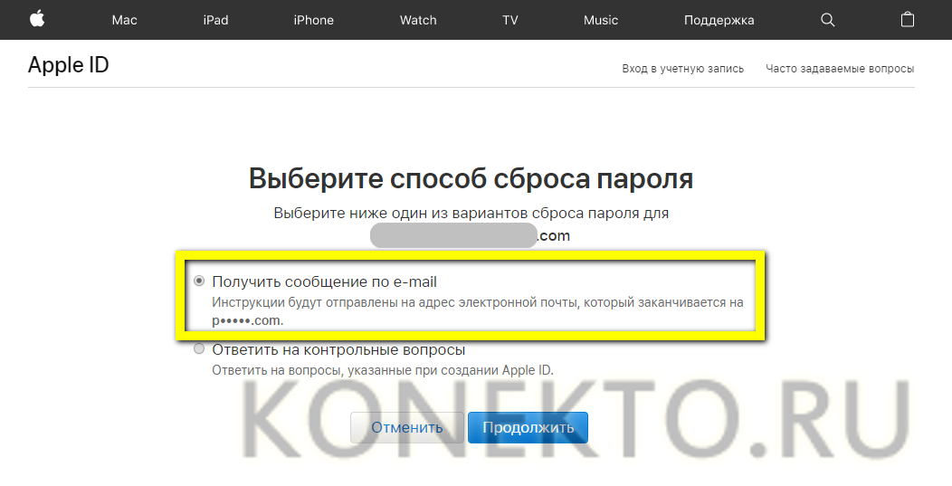 И указать, как именно планируется восстановить возможность авторизации в iCloud. Выбрав первый (письмо на указанный при регистрации адрес электронной почты), обладатель Айфона.