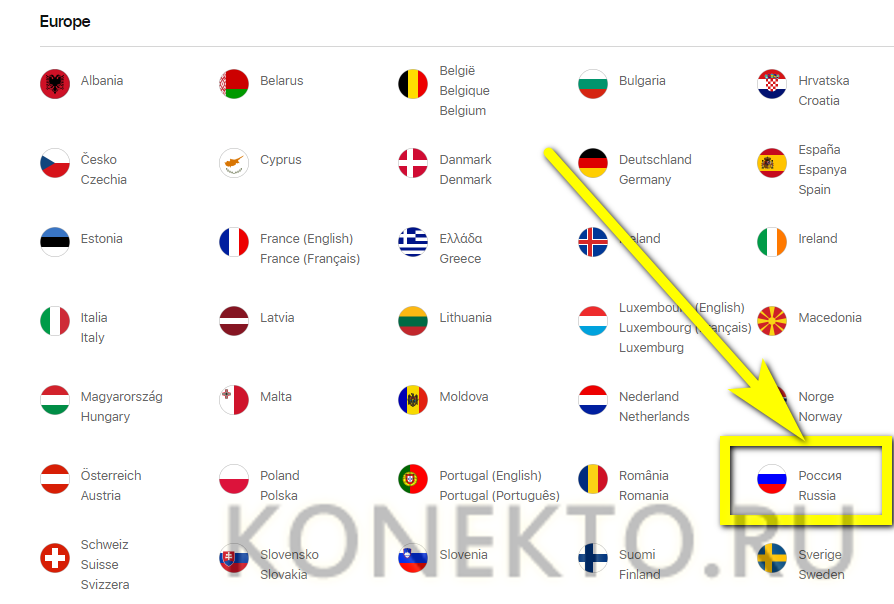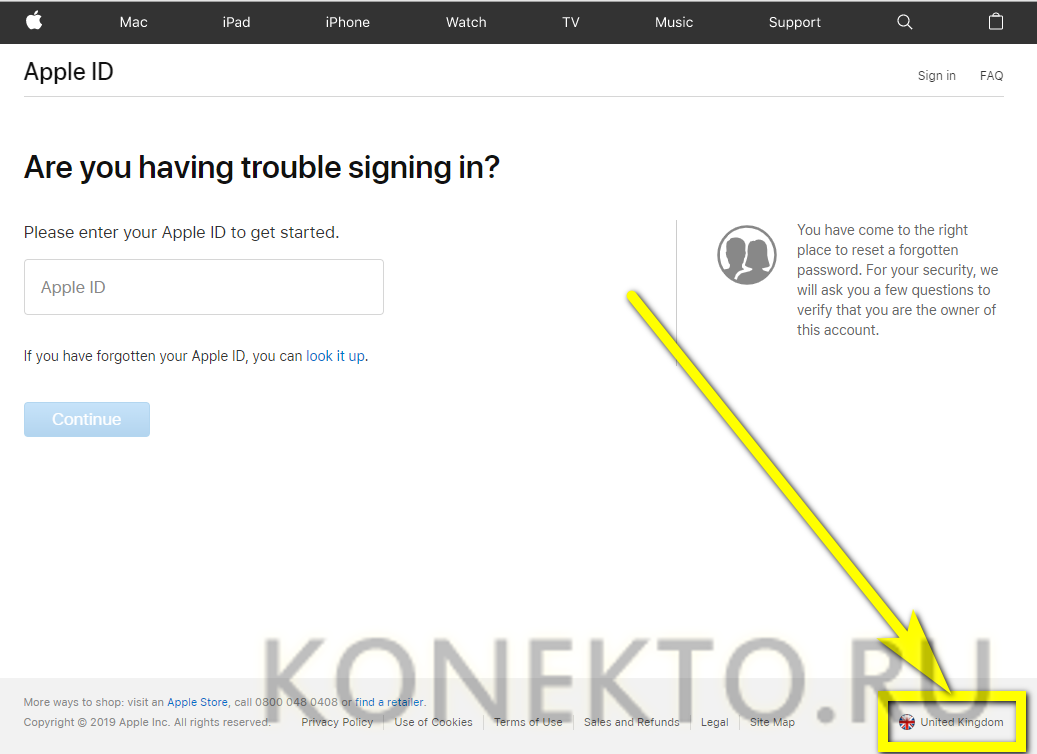 В результате пользователь будет перенаправлен на страницу официального сайта Apple. Узнать здесь свой код доступа, как уже упоминалось, не получится; кроме того, с некоторой долей вероятности пользователю придётся разбираться с английским интерфейсом. Чтобы перейти на русский, следует щёлкнуть по круглому значку с флагом в правой нижней части окна браузера.