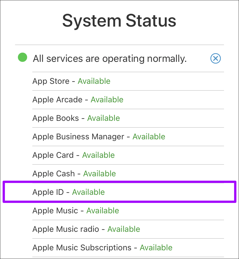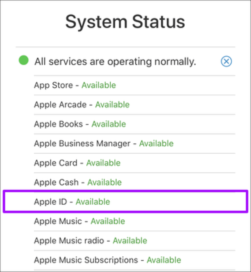 Проблемы на стороне сервера также могут помешать вам выйти из своего Apple ID. Чтобы определить, так ли это, начните с загрузки Статус системы Apple страницу в Safari. Затем проверьте статус рядом с Apple ID — если он указывает на какие-либо проблемы, подождите пару часов и повторите попытку.