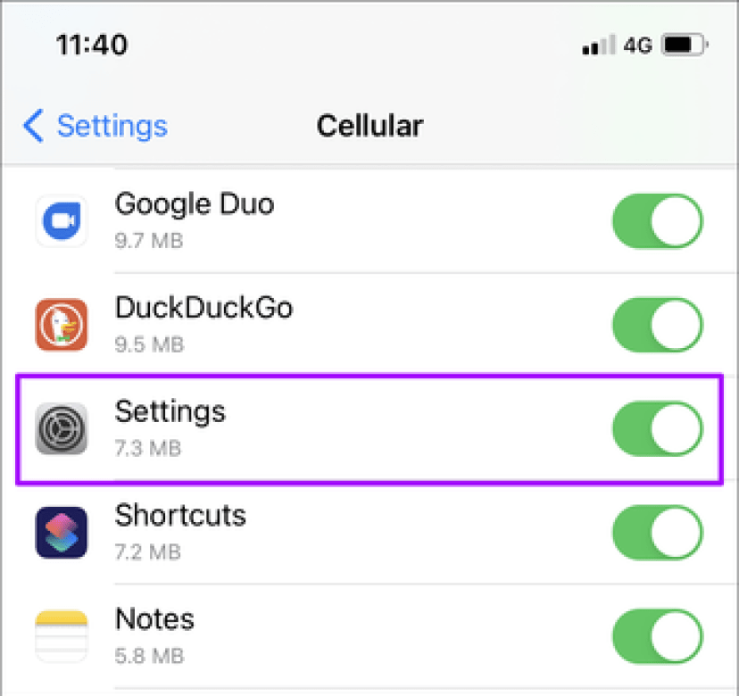 Вы отключили сотовую передачу данных для приложения «Настройки»? В этом случае вы обнаружите, что опция выхода вашего Apple ID неактивна. Чтобы решить эту проблему, подключитесь к Wi-Fi или включите сотовые данные для приложения «Настройки» (перейдите в «Настройки»> «Сотовая связь» и включите переключатель рядом с «Настройки»).