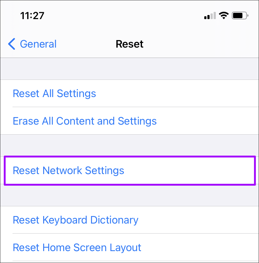 Постоянные проблемы, связанные с сетью, также могут привести к тому, что параметр выхода Apple ID будет выделен серым цветом. Следовательно, рассмотрите возможность сброса сетевых настроек на вашем устройстве. Зайдите в Настройки> Общие> Сброс, а затем выберите Сбросить настройки сети.