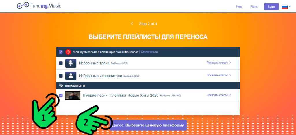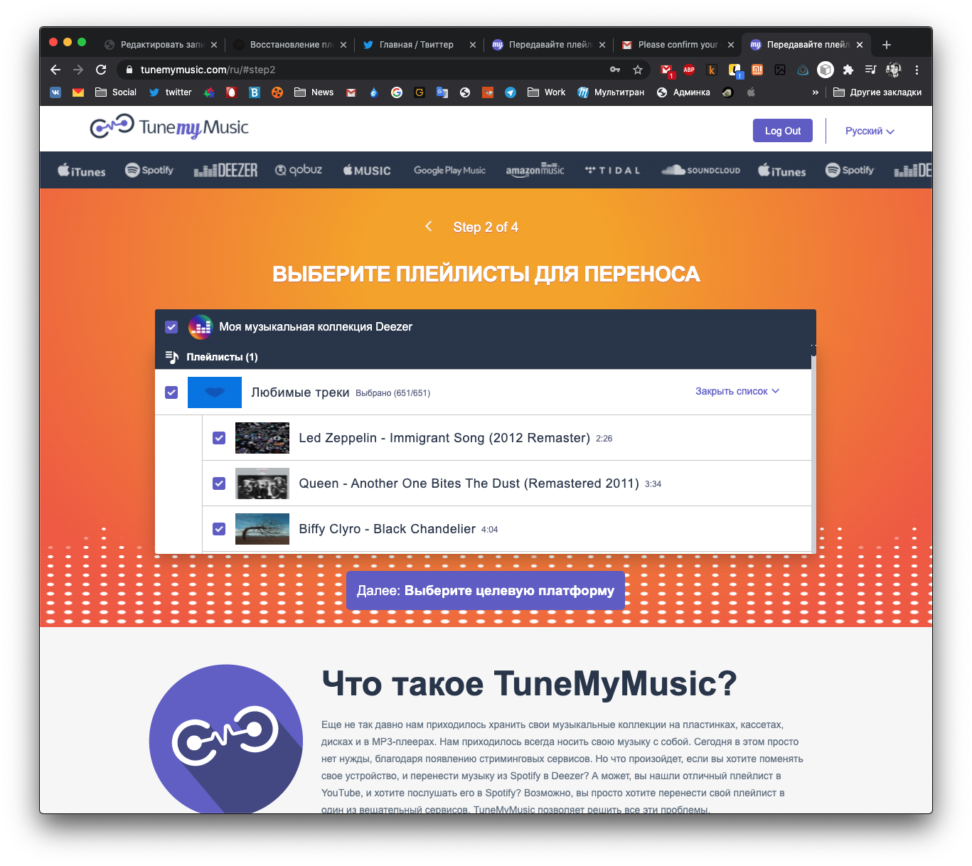 Выбираем плейлисты для переноса и переходим на следующий этап кликом по кнопке “Далее: Выберите целевую платформу”