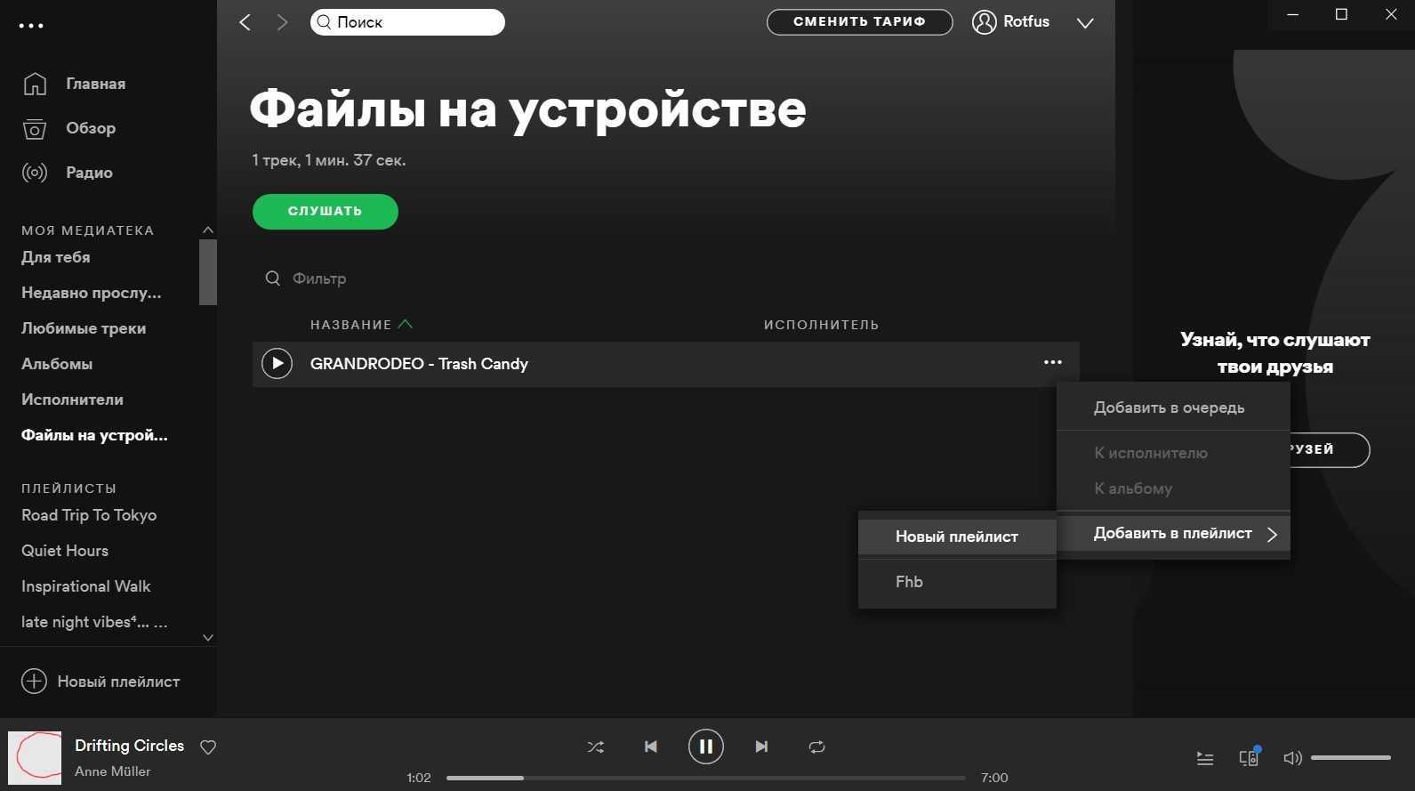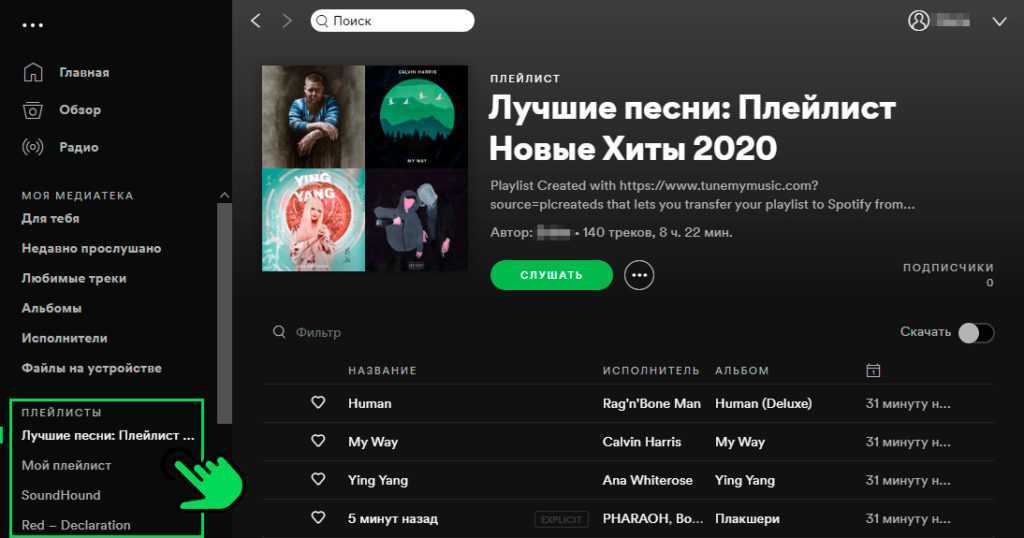 Импортированная из другого сервиса музыка будет отображаться в Спотифай в разделе “Плейлисты” на ПК: