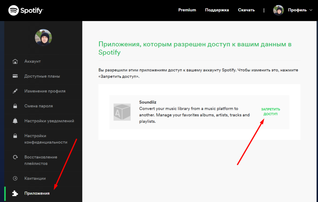 После того, как мы перенесли всю нашу музыку из сторонних аудио сервисов. Мы можем отозвать разрешение у приложений из Spotify. Для этого необходимо: