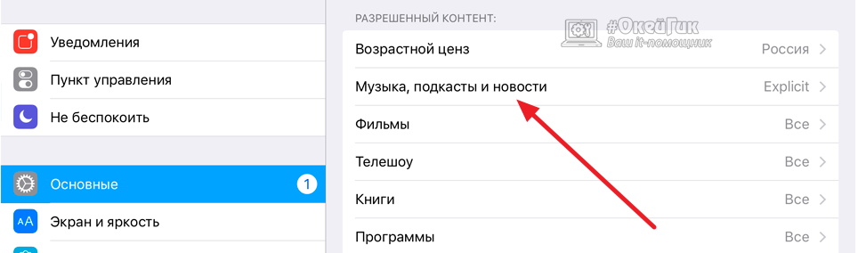 - Перейдите во вкладку Ограничение контента > Музыка, подкасты и новости.