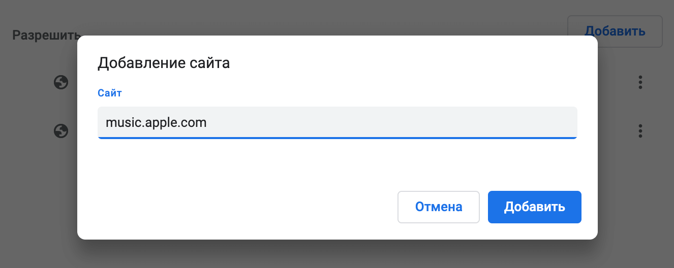 В поле «Разрешить» нажмите «Добавить» и добавьте туда сайт music.apple.com.