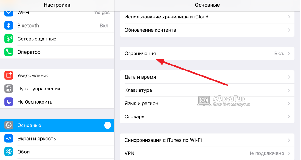 Выбрать пункт «Основные» и перейти в раздел «Ограничения». На этапе входа в раздел потребуется ввести пароль, установленный на устройстве