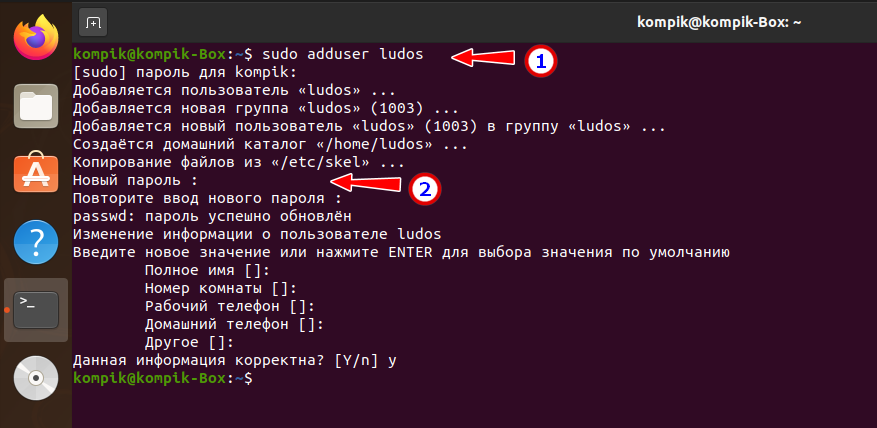 Чтобы создать нового пользователя, выполняем команду adduser и указываем имя пользователя (вместо pupkin укажите имя пользователя, которого вы создаете):