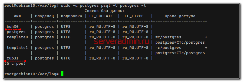 Проверить перечень созданных баз можно командой: