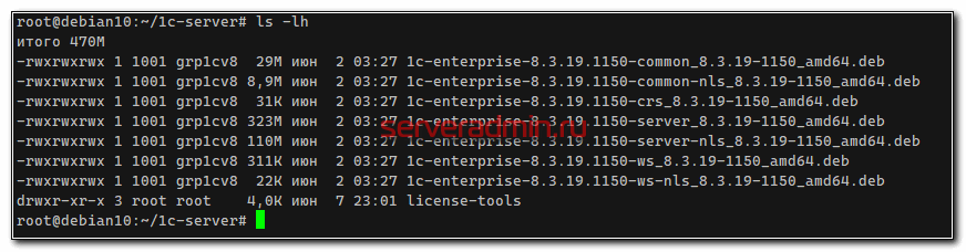 # mkdir 1c-server # mv deb64_8_3_19_1150.tar.gz 1c-server/ # cd 1c-server/ # tar xzvf deb64_8_3_19_1150.tar.gz # rm deb64_8_3_19_1150.tar.gz