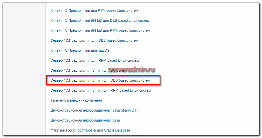 Теперь нам необходимо скачать deb пакеты сервера с портала 1С. Для этого логинимся под действующей учетной записью на https://releases.1c.ru и скачиваем файл Cервер 1С:Предприятия (64-bit) для DEB-based Linux-систем.