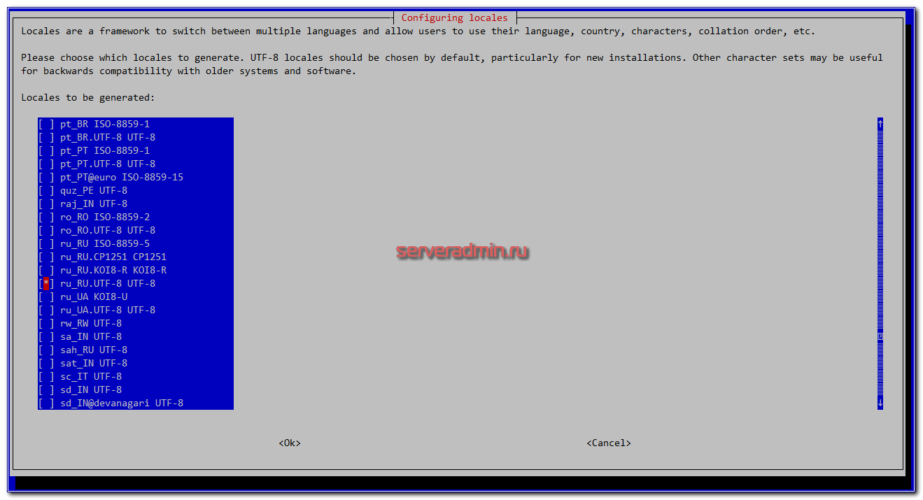 Нам нужно выбрать ru_RU.UTF-8 UTF-8. Так же убедитесь на всякий случай, что en_US.UTF-8 тоже выбрана. В дефолте так и должно быть, но я сталкивался с ситуациями, когда эту локаль тоже приходилось добавлять.