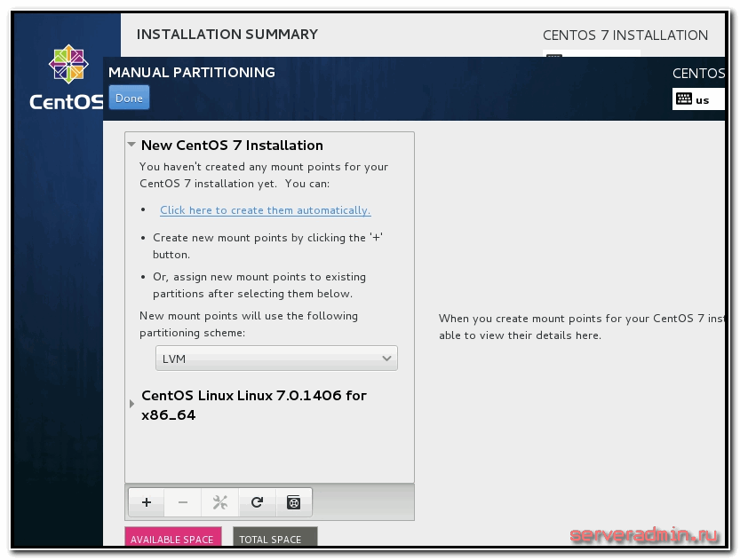 Теперь рассмотрим наиболее сложный вариант установки. Мы будем ставить CentOS 7 на программный рейд. Для примера возьмем 2 диска и raid 1. Все установки будут такие же, как мы рассмотрели ранее, кроме одной — INSTALLATION DESTINATION.