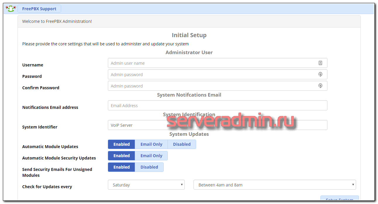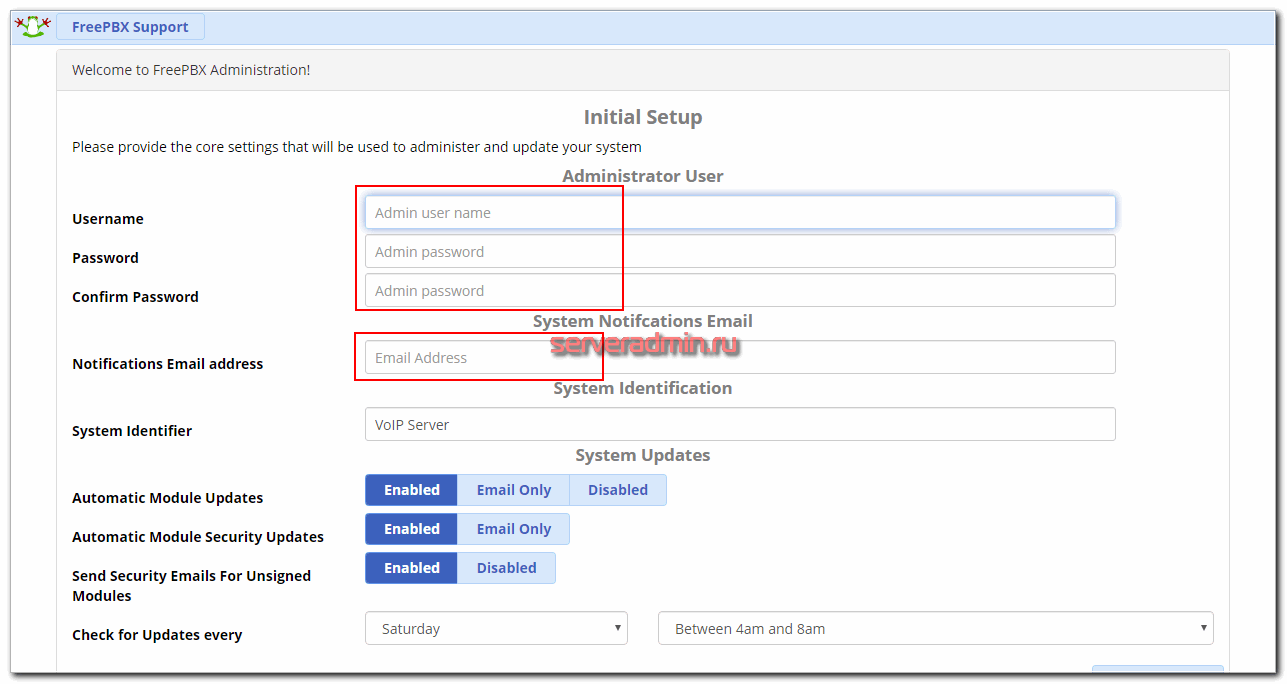 Заходим в web интерфейс freepbx еще раз и создаем администратора.