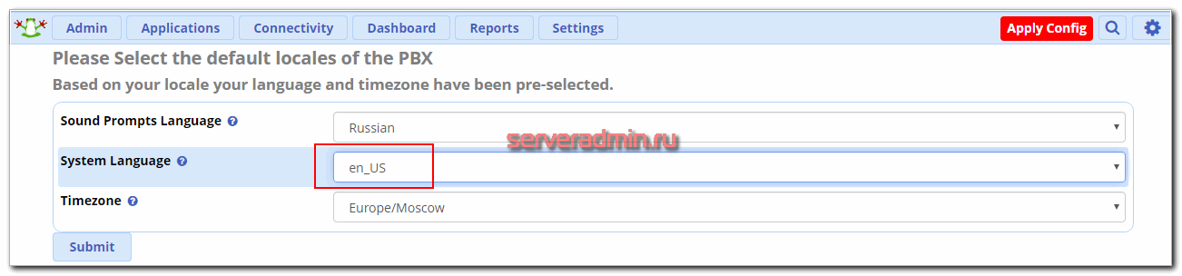 Потом, используя созданную учетку, логинимся в панель и указываем начальные настройки. Рекомендую выбрать английский язык. Как я уже говорил, перевод на русский так себе, с ним иногда бывает сложно понять суть настроек.