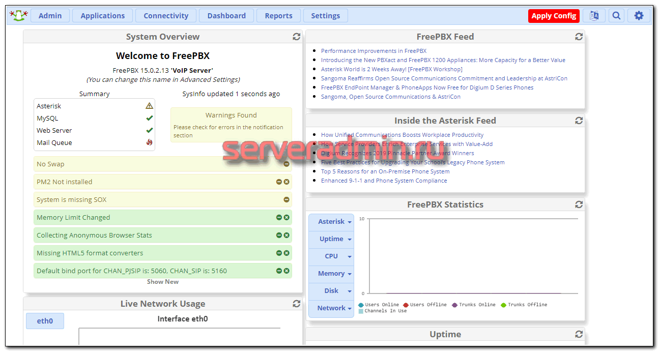 После этого оказываетесь в веб панели Freepbx. Нажмите сверху на Dashboard и увидите сводную информацию по системе. Теперь можно начинать ее настройку, но это тема отдельной статьи. Возможно, до нее у меня когда-нибудь дойдут руки.